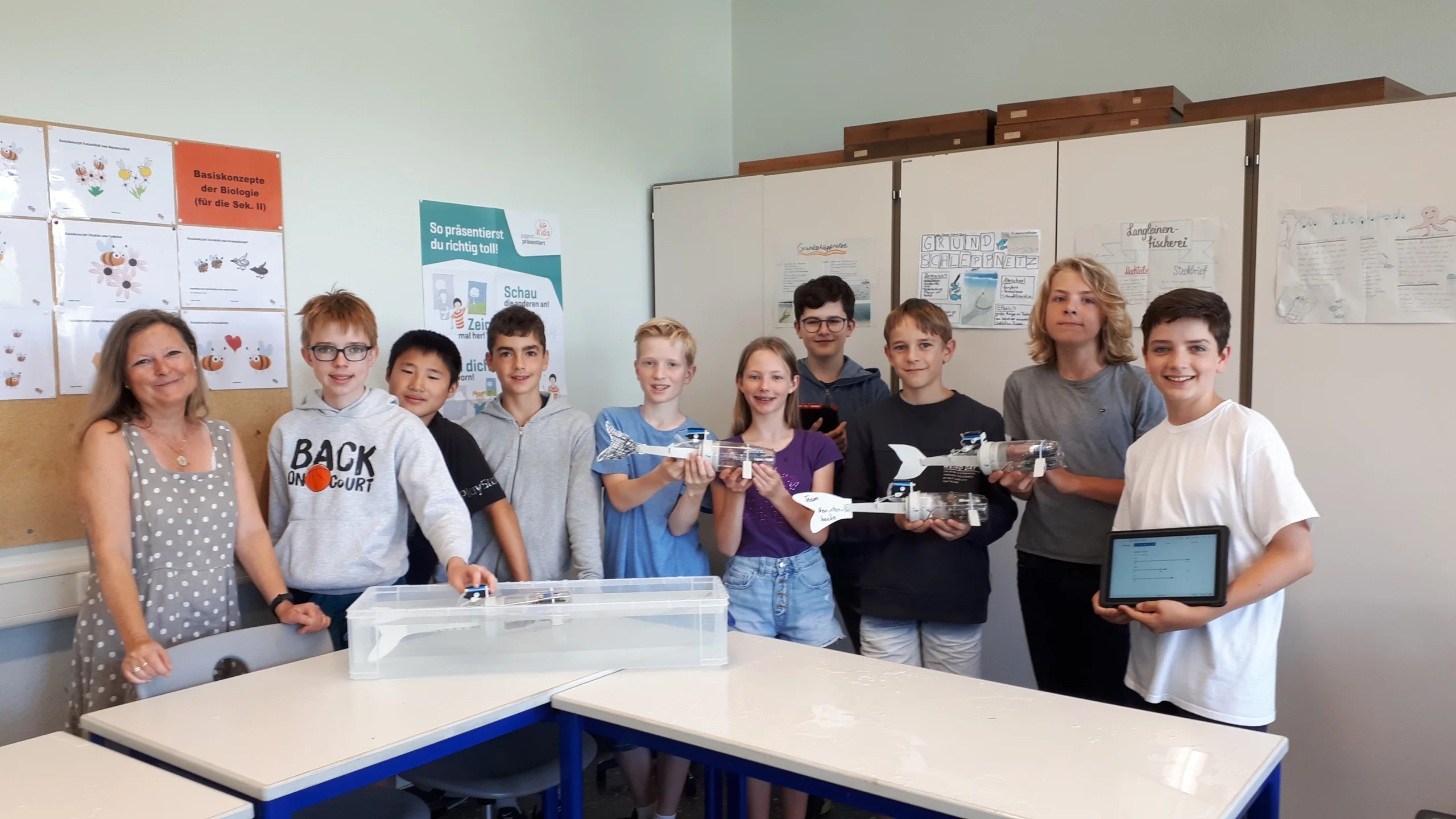 Am zweiten Tag des Workshops standen die Roboterfische im Mittelpunkt. Die Schüler:innen gestalteten Flossen für ihre Fische und ließen ihre Roboterfische in einem spannenden Wettkampf gegeneinander antreten. Mit viel Begeisterung testeten die jungen Forscher ihre Konstruktionen in einem Wasserbecken und optimierten ihre Modelle.