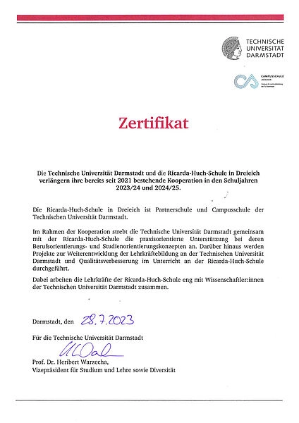 Die Technische Universität Darmstadt und die RHS verlängerten ihre bereits seit 2021 bestehende Kooperation bis 2025. Damit ist die RHS auch weiterhin Campusschule der TU Darmstadt. Eine Campusschule bezeichnet eine Partner- bzw. Kooperationsschule, die nachweislich eine langfristig beabsichtigte und intensive Zusammenarbeit mit der Universität pflegt.