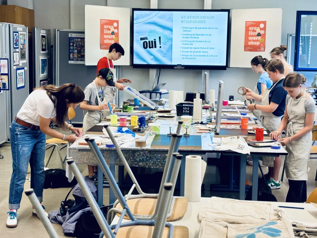 Simone Straub und Alexandra Kolar-Hérault boten den Schüler:innen nicht nur einen Einblick in die handwerkliche Technik des Siebdrucks, sondern auch einen Raum für kreative Entfaltung. Die Ergebnisse konnten sich sehen lassen: T-Shirts, Stofftaschen und Poster, die die Schüler:innen stolz mit nach Hause nahmen.