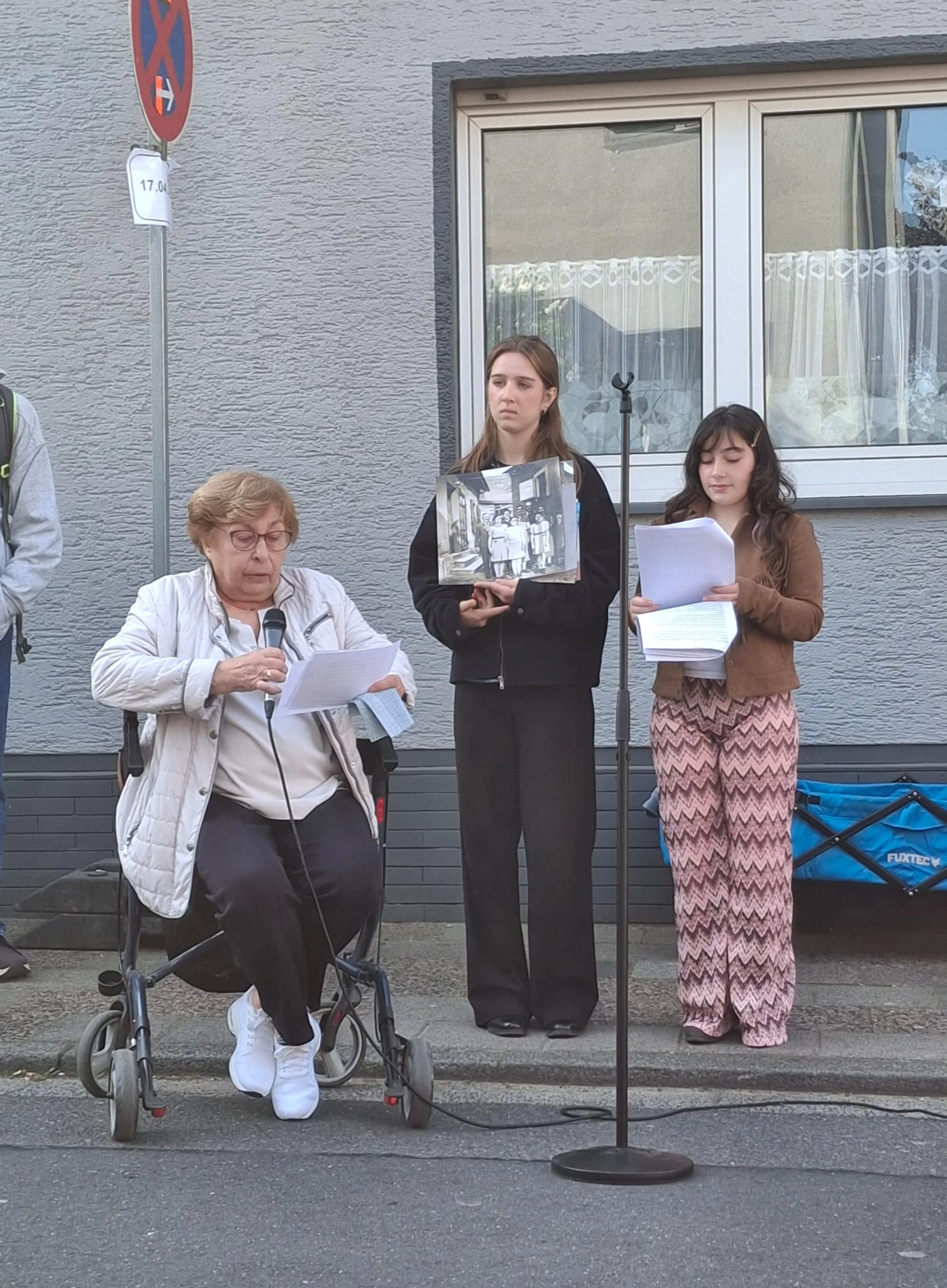 Die Schülerinnen Katharina und Stella aus dem Leistungskurs Geschichte der Q2 unserer Schule hatten sich im Vorhinein mit der Geschichte der Familie Bendheim in der Kanonenstraße 2 auseinandersetzt und erzählten über die Schicksale der einzelnen Familienmitglieder, die mit alltäglicher Ausgrenzung, Trennung von Familienmitgliedern und Fluchtversuchen konfrontiert waren. Ergänzend wurden Bilder gezeigt, darunter ein Foto des großen Überseekoffers, der immer bereitstand, aber nie genutzt werden konnte. Trotz der erdrückenden Umstände hätte die Familie dennoch auch Unterstützung aus der Nachbarschaft erhalten, so schilderte Katharina. Die Sprendlinger Zeitzeugin Lore Schwarz berichtete anschließend von ihren Erinnerungen an die Familie Bendheim, wie ihre Mutter der Familie Unterstützung bot und welche Gefahren damit verbunden waren. Sehr präsent war das Thema der Ungewissheit über die Zukunft der schrumpfenden jüdischen Bevölkerung Dreieichs zur damaligen Zeit.